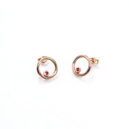 A pair of dainty earrings, these bands of 9ct rose gold, highlighted with sweeping grooves, showcase a pair of 1.5 mm high-quality rubies that catch the light as you move.