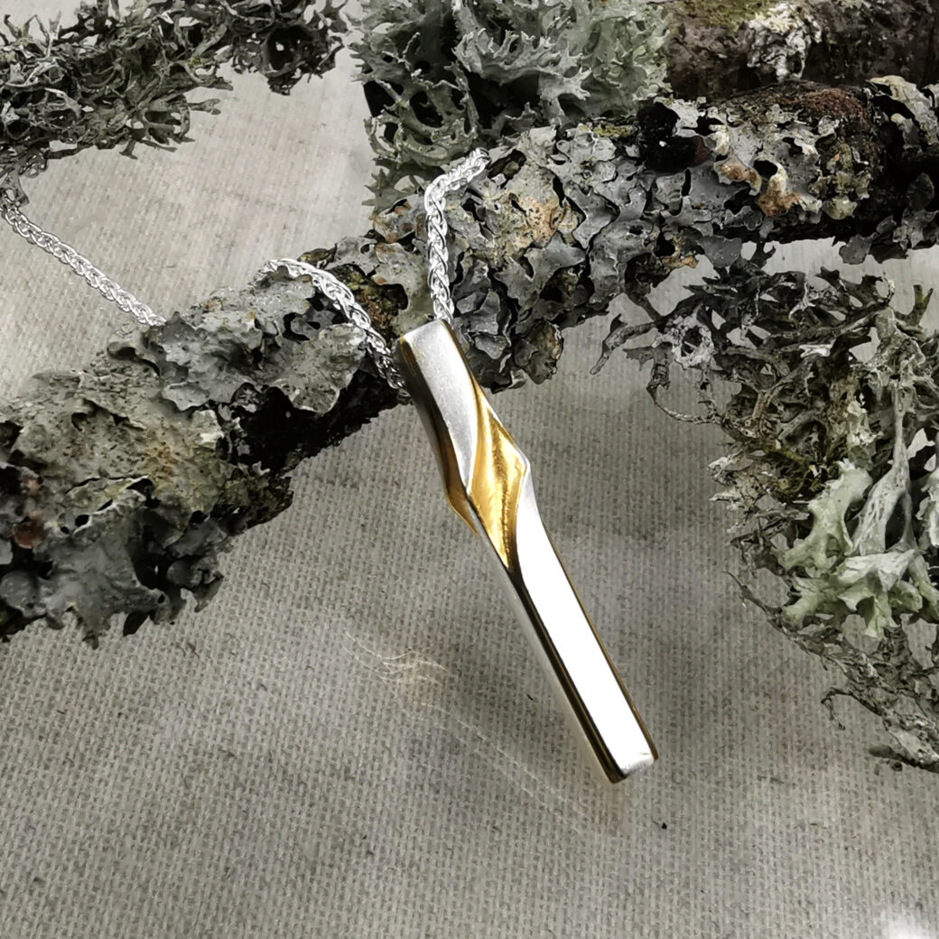 The Twist Arch pendant combines modern elegance with timeless design. Crafted from sterling silver, this small pendant features a twisted arch shape highlighted with delicate gilt detailing. The sweeping gold accents enhance the texture of the silver, creating a subtle yet striking effect as it catches the light.