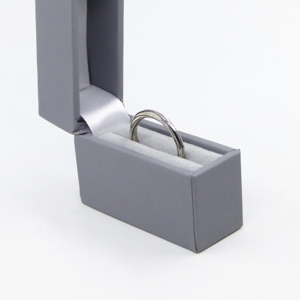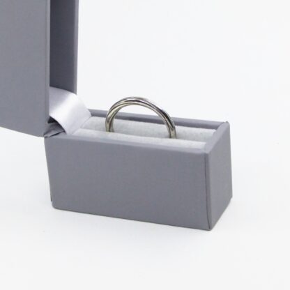 A simple but elegant twist detail wedding ring, this band of 9 carat white gold, highlighted with sweeping grooves. With a narrow round cross section, this dainty ring is comfortable for everyday wear, and can easily be worn stacked with other rings.